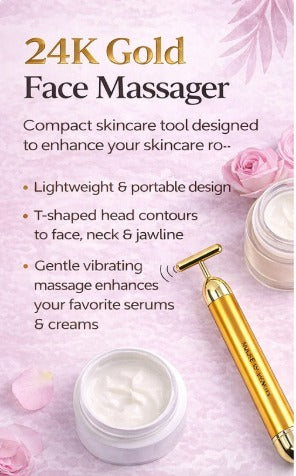 Transform your skincare routine with our premium 24K Gold Face Massager! This compact, lightweight tool is designed to enhance your skincare routine with gentle vibrating massage that works perfectly with your favorite serums and creams.